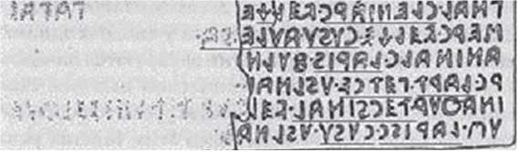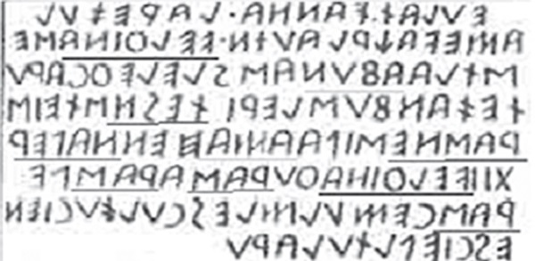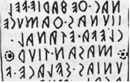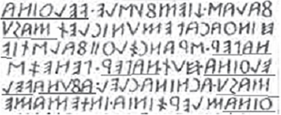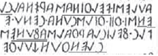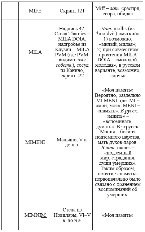**MINI MVL FANI – часто встречается в этрусских текстах. Вероятно, переводится как небольшое святилище. В слове MNI фигурирует большая буква «М», при этом налицо сокращение от MINI, что указывает на прочтение большой «М» как слоговой буквы – «Mi», «Me».