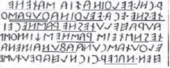 В тексте, так же как и в надписи из Пирги, отсутствует буква «P», присутствует «D», читаемая как «R» (русск. «Р»). При этом в двух случаях в слове LVD написана «D» иначе, т. е. вероятно, что в этом слове она читается как «D». Буква «О» написана с точкой в центре, тем не менее на фоне отсутствия обычной «О», читается как «О». Возможно, подобное написание указывало на более длинное ее звучание.