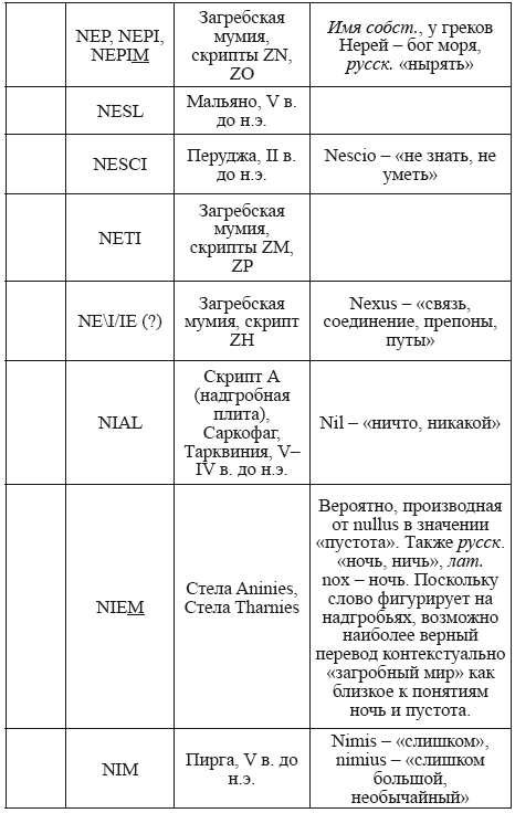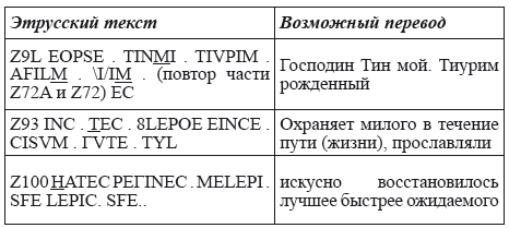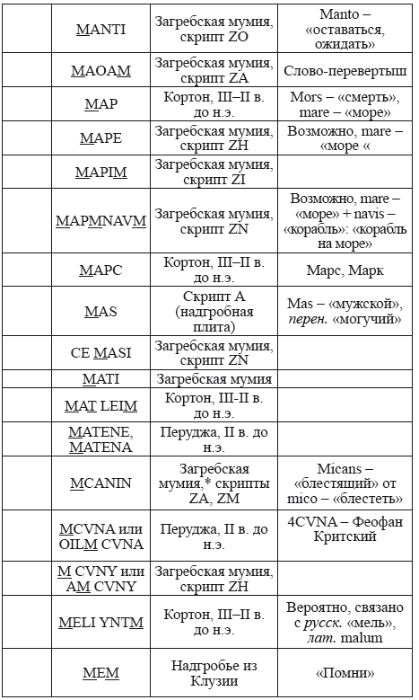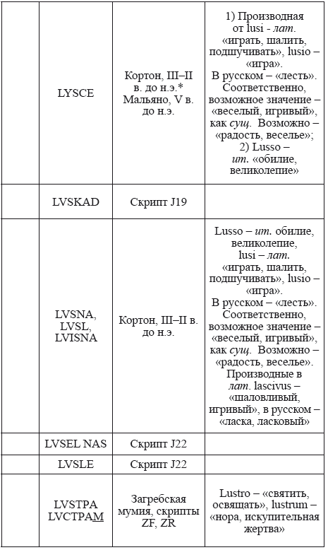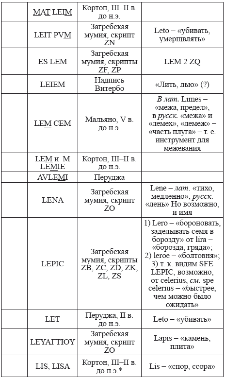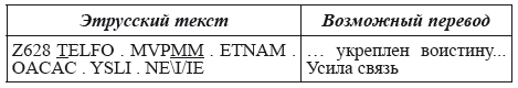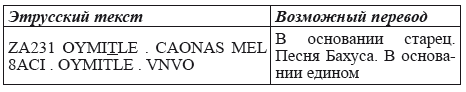 Возможно, что описано все же одно и то же событие. Мы видим сходную тему: в этрусском тексте речь идет о пророчестве о сожжении города, в финикийском звучит «ночью зажег небо». Затем следует указание на то, что: город питал своим источником – в этрусском тексте; в финикийском мы также видим ссылку на питающий источник. Любопытно, что для этого применены два разных слова, оба известные нам по латыни, которые мы можем трактовать как «источник, питание»: это almus в финикийском и lac в этрусском.
