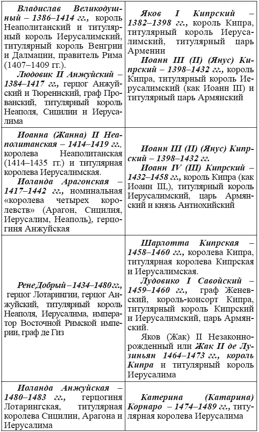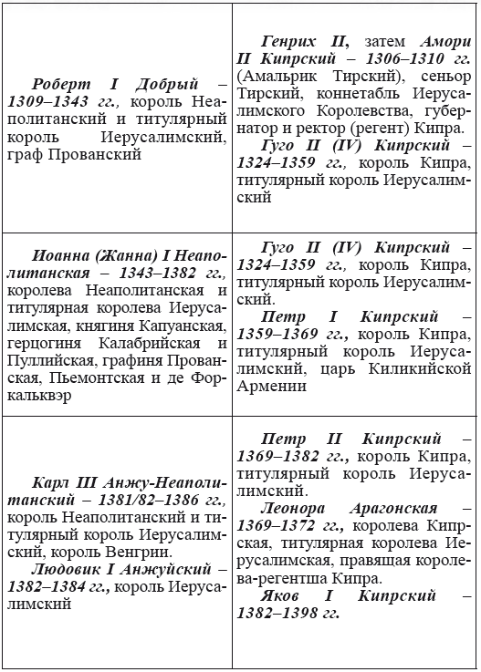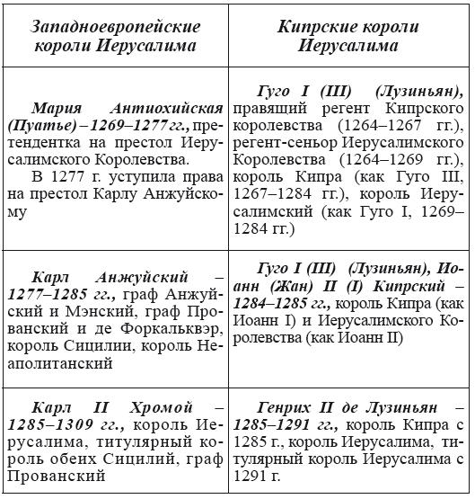 Единственно возможный вывод, который можно сделать из сосуществования двух линий иерусалимских королей – на момент как минимум разделения ветвей, т. е. на 1269 г., формально существовало уже два Иерусалима.