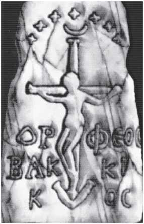 Как мы видим, на нем изображен распятый человек, и стоит надпись «Орфеос, Ваккюс» – Орфей, Вакх. Орфики объединяли Орфея с Дионисом-Вакхом. Странным является то, что, несмотря на то, что запись осуществлена греческими буквами, упомянуто имя именно римского Вакха, а не греческого Диониса, причем соблюдено латинское написание двух букв «К» – лат. Bacchus.