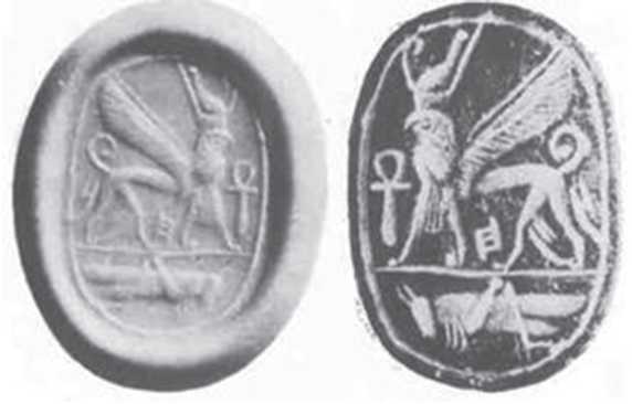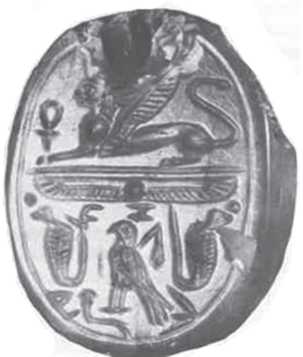 Как удалось прочитать на этой печати IX–VIII в. до н. э. на иврите имя «Иезевель» и отнести это к жене израильского царя Ахава, большой вопрос. Мы же видим, несомненно, египетское изображение: сфинкс, крылья с кругом, Хор-сокол и охраняющие тайну змеи.
