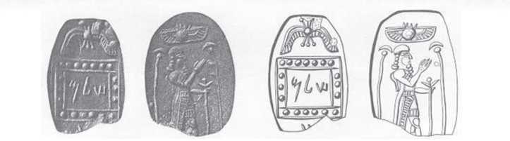 Эту печать относят ко времени Соломона. Хотя мы снова видим изображение, характерное для иранцев и египтян: знак крыльев с кругом применялся и в Шумере, и у египтян, но в данном случае более корректно его трактовать как символ Ахура Мазды, учитывая известную традицию изображения царей Ахеменидов под ним. Аналогичное изображение имеется и на печати