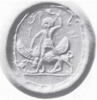 Комментарий к этой печати VIII в. до н. э. поражает очевидной безграмотностью: оказывается, что мы имеем дело «с изображением человека, воюющего с грифоном», и переводится надпись как «принадлежащее Иекамияу».