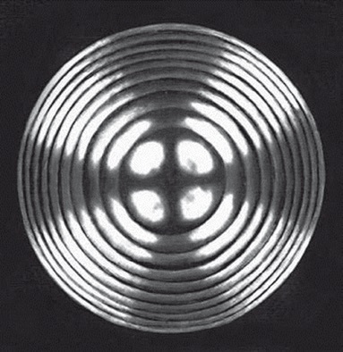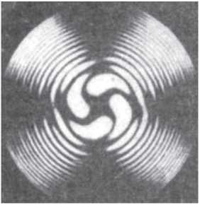 Интерференционная фигура для двух пластинок кварца (правого и левого) в срезе, перпендикулярном оптической оси. Отметим, что на фото присутствует все тот же черный и, соответственно, белый крест. Поразительно, но фактически на интерференционных картинах кварца мы видим две самые древние и почитаемые фигуры – крест и свастику.