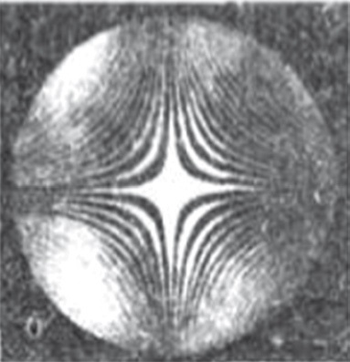 [Закрыть] фигура, наблюдаемая в сходящихся лучах, – в случае, когда срез пластинки перпендикулярен оптической оси кристалла, он имеет вид темного креста. Такая фигура является уникальной отличительной особенностью кварца и характерна для монокристаллов кварца и обусловлена способностью кварца вращать плоскость поляризации.