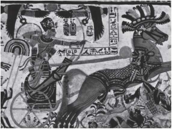 Направление солнечных лучей или иных волн обозначалось и стрелой, как на фреске из гробницы Тутанхамона: тетива лука прикреплена к шару наверху – видимо, солнцу, стрела направлена по касательной к шару, укрепленному на оглобле, помещая в итоге шар в угол, образованный стрелой и оглоблей. Расположение крыльев птиц, возможно, указывает на необходимый наклон зеркал.