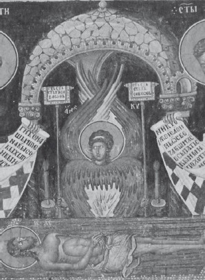 [Закрыть] этимологически связанный с индоевропейским «агни, огонь». Так что вполне возможно, что херувим также является древним «техническим» символом буквально вспышки или огня. Херувим изображается и непосредственно внутри сени-кувуклии, его аналогия с огнем видна по расположению крыльев. Художники также пытались указать, что использовались и молнии; это хорошо видно на фреске Грачаницы – над головой херувима и на его груди «белыми перьями» изображена молния.