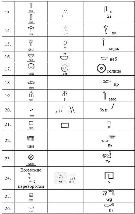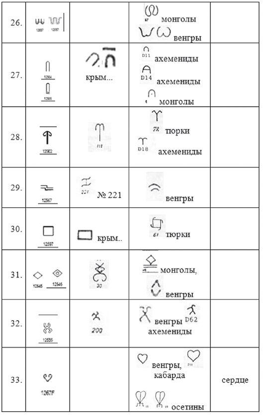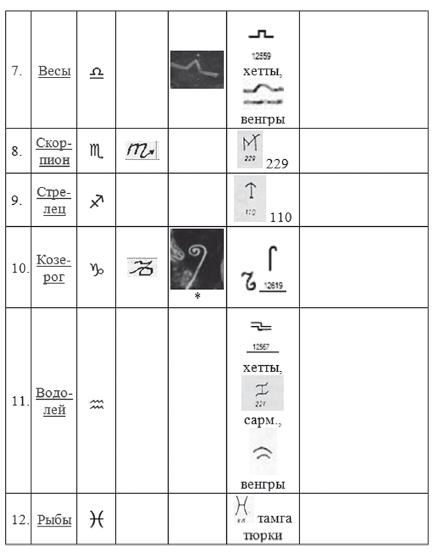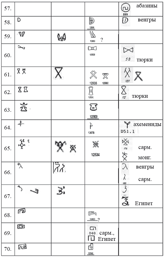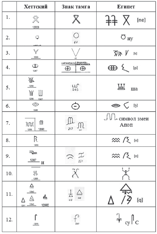 ТАБЛИЦА 4. Сравнение знаков египетской и хеттской иероглифической письменности и знаков тамга