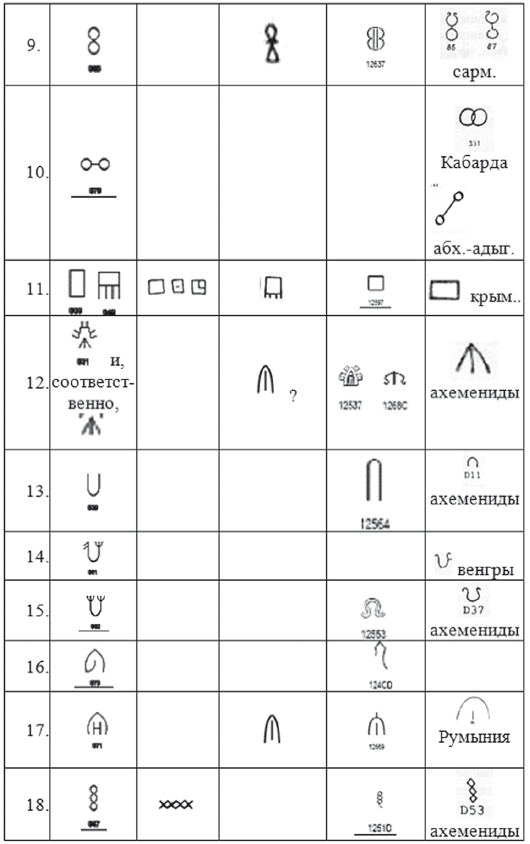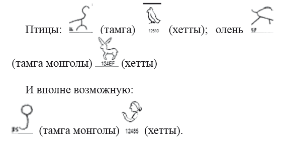 Мы привели, по всей вероятности, не все возможные аналогии. Некоторые знаки были стилизованы. Например, в монгольских тамгах можно увидеть вот такую очевидную стилизацию хеттских знаков: