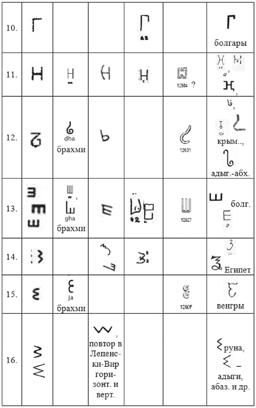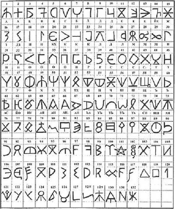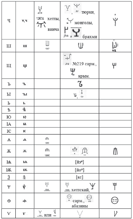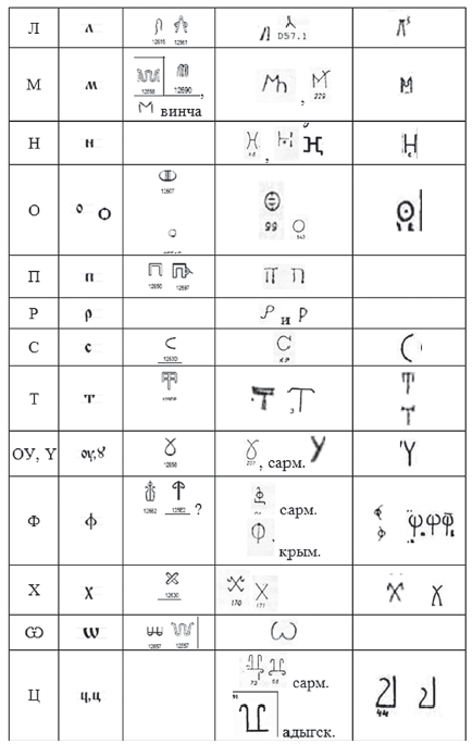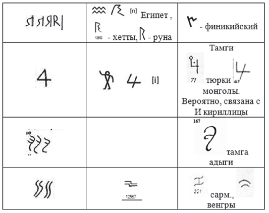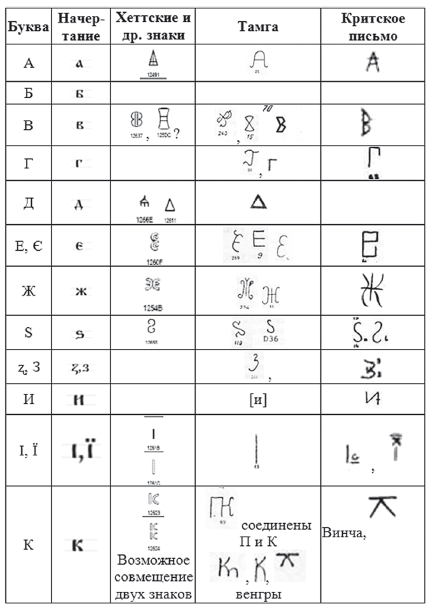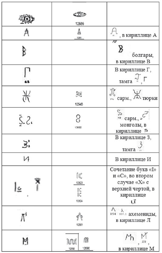 Сравнение букв кириллицы с тамгами и знаками древнего письма