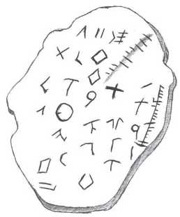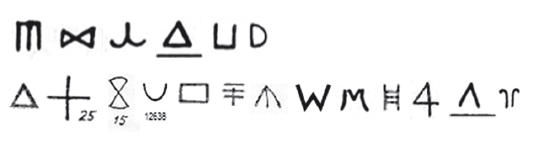 Легко опознаваемые знаки, известные практически по всем древним европейским письменным системам и тамгам: «круг», «ромб», «крест», «елочка», «Х», «L», «T», «C», «I», «Ь», «Г».