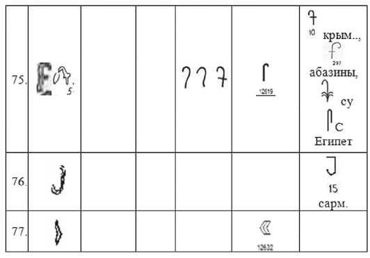 Применение знаков тамга обусловлено наибольшим процентом совпадений, хотя изредка применены знаки других письменностей. Рассмотрены только читаемые знаки.