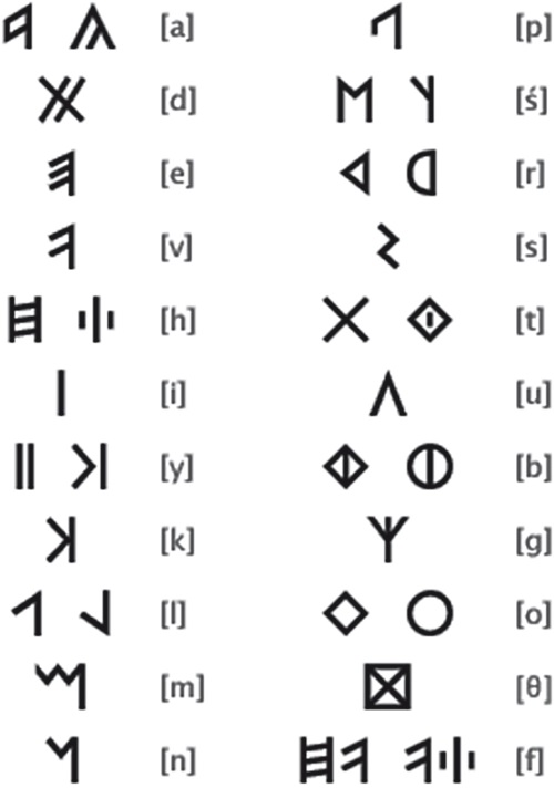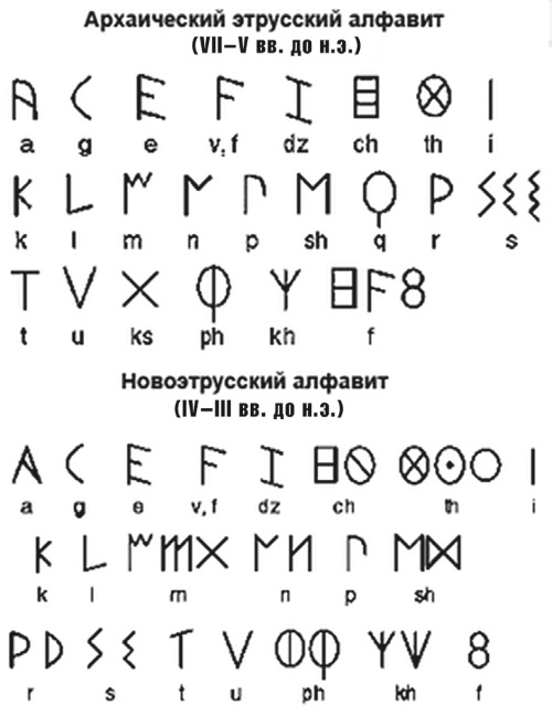Очевидно сходство с другими древними системами письма и тамгами этрусского и венетского алфавита, поэтому мы лишь приведем сами алфавиты.