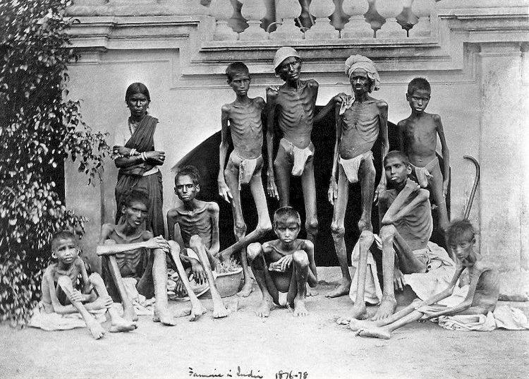 Так британская Индия страдала от повторяющихся масштабных вспышек голода, что стало результатом политики колониальных властей по разорению местного ремесленного производства, освобождавшего рынок для английских промышленных товаров, по увеличению налогов на земледельцев и приватизации общинной земли, что то вело к последующему развалу ирригационных и других общественных хозяйственных систем[220]220