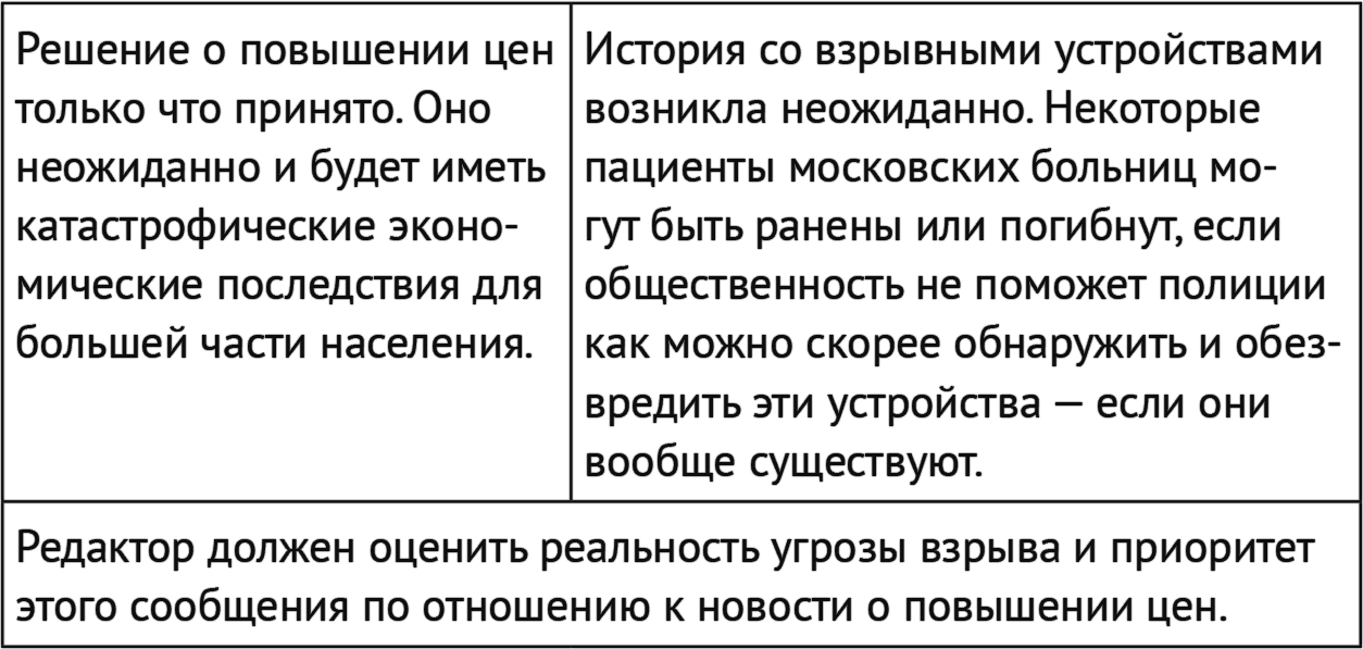 В других случаях выбор приоритетов основывается в конечном итоге на личных вкусах и опыте редактора. Допустим, речь идет о выборе между неожиданным решением парламента о повышении цен и сообщением о том, что группа террористов якобы разместила взрывные устройства в помещениях некоторых московских больниц. Оба эти сюжета соответствуют требованиям актуальности, неожиданности и важности.