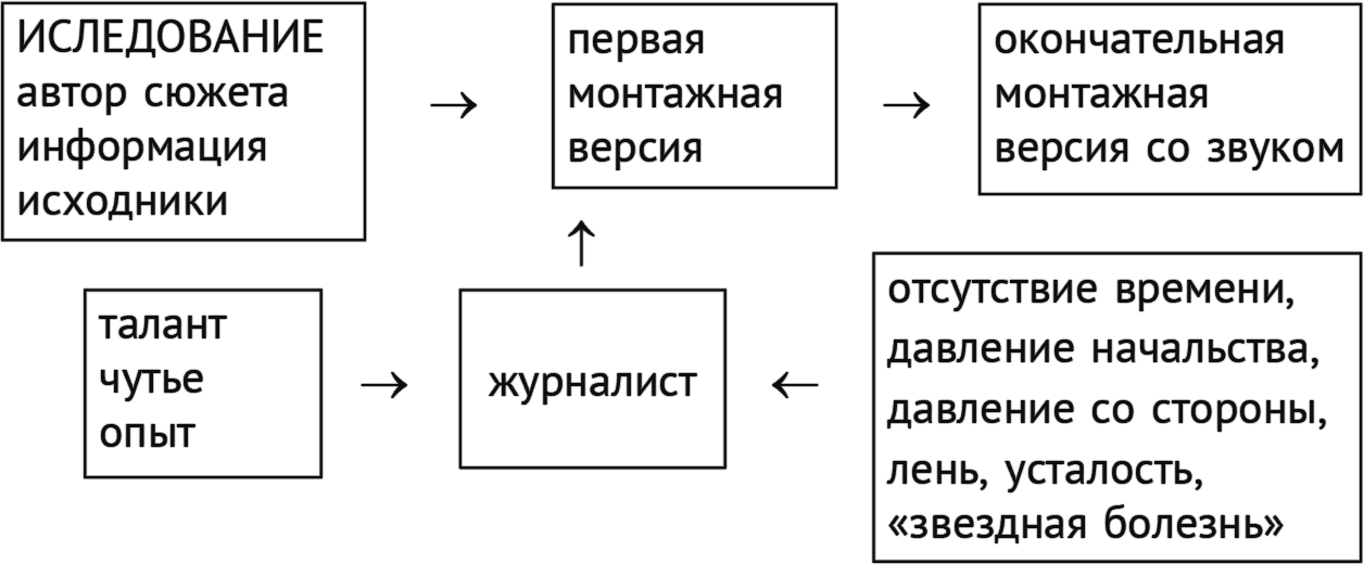 Могут быть и другие варианты. Конечно, в условиях нехватки времени на подготовку сюжета часто приходится пренебрегать этой аналитической работой, но именно она и только она приносит результат. Сюжет делается не на съемочной площадке, а на бумаге – или как минимум в вашем сознании, модель функционирует как своего рода испытательный стенд, на котором журналист может выверить тему, определить свою роль в сюжете, правильно расставить акценты и отработать содержание своего обращения к зрителям еще до начала фактической работы над материалом. И тогда такой сюжет войдет в заветную тройку лучших, которые зритель может вспомнить после просмотра программы новостей.