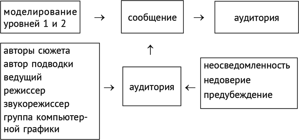 На уровне В роль субъекта играют зрители, а роль объекта – заявление или сообщение, с которым журналист обращается к зрителям. Схематично модель выглядит следующим образом (см. следующую страницу):