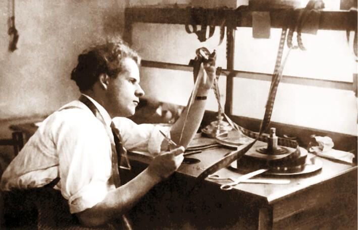 Режиссер С. М. Эйзенштейн за монтажным столом. 1928. [ГЦМК]