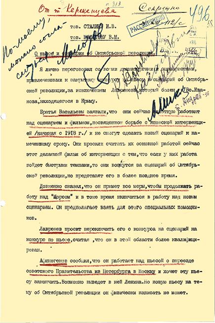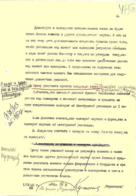 Докладная записка председателя Комитета по делам искусств при СНК СССР П. М. Керженцева И. В. Сталину и В. М. Молотову о конкурсе на пьесу и сценарий об Октябрьской революции. (Утверждено постановлением Политбюро ЦК ВКП(б) 17 апреля 1936 г.) 1 апреля 1936