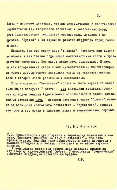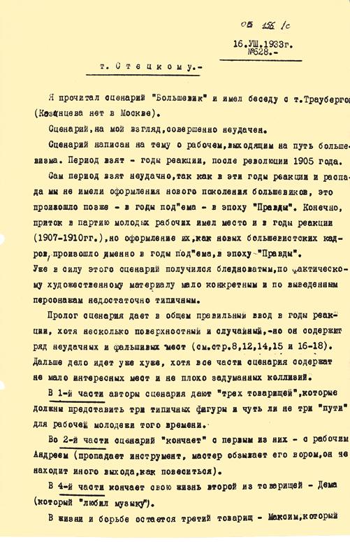 Отзыв А. С. Бубнова на сценарий фильма «Большевик». 16 августа 1933