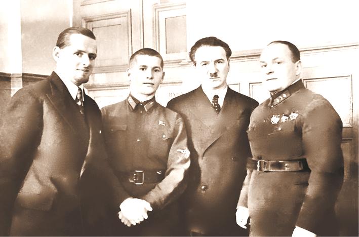 Делегаты XVI Всероссийского съезда Советов в кулуарах съезда: режиссер и автор фильма «Чапаев» С. Д. Васильев, сын Чапаева – А. В. Чапаев, руководитель советского кинематографа Б. З. Шумяцкий, комиссар 11-го стрелкового корпуса Е. И. Ковтюх. 1935. [РГАКФД]