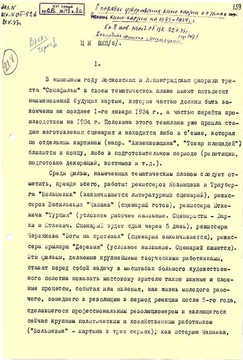 Докладная записка Б. З. Шумяцкого в ЦК ВКП(б) о порядке утверждения кинокартин и о темах кинофильмов на 1933 и 1934 годы. 7 июня 1933