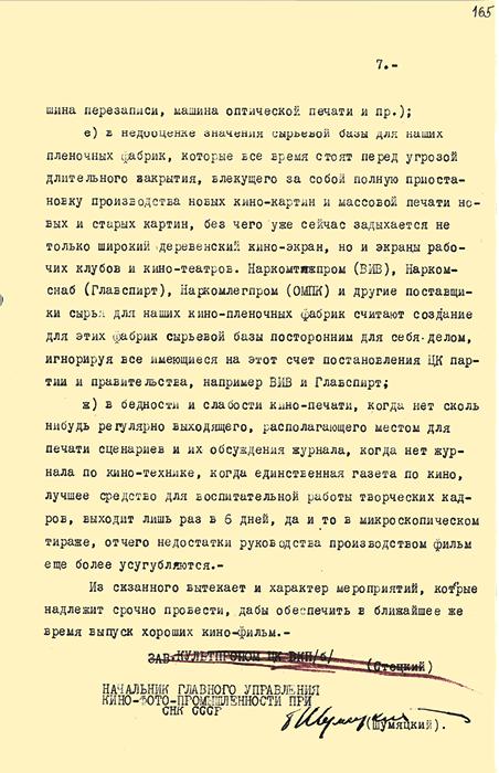 Подлинник. Машинописный текст. Подпись – автограф Б. З. Шумяцкого. [РГАСПИ. Ф. 17.Оп 114. Д. 352. Л. 159, 165]
