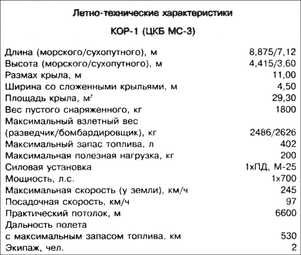 Задание на разработку перспективного катапультного разведчика КОР-2 появилось уже в конце 1938 г. Но КОР-1 на вооружение все-таки приняли в качестве переходной машины до поступления на вооружение нового корабельного гидросамолета. Основным мотивом такого решения было желание получить опыт эксплуатации катапультного самолета в реальных корабельных условиях и подготовить кадры летчиков и технических специалистов авиационных боевых частей крейсеров.