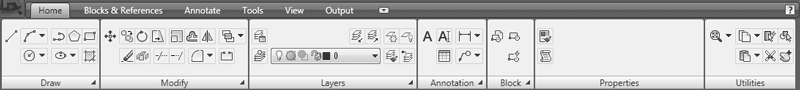 • Home (Главная) – вкладка содержит по умолчанию команды рисования, редактирования, работы со слоями, проставления размеров, простейшие команды работы с блоками, команды изменения свойств и утилиты;