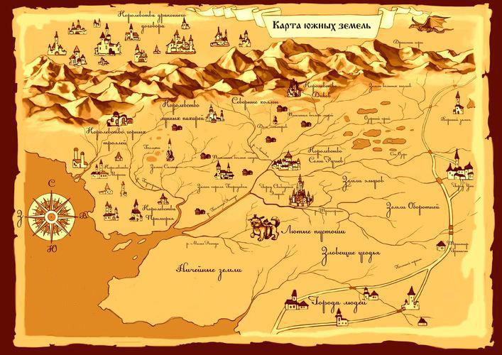 Для лучшего ориентирования на местности принц вызвал в сознание карту, которую позаимствовал из памяти Бародура. Явственно увидел глазами колдуна собеседника – высокого плотного человека с мясистым носом и мохнатыми бровями в тёмных одеждах. Он придерживал руками разложенный на столе пергамент, на котором были нарисованы земли южнее Руссении, степи, пустыни. И в самом низу указывались извилистые ленты рек – первая была голубого цвета, а вторая – жёлто-красная. Незнакомец указал на нарисованные пески и пояснил, что именно здесь ещё до первой реки начинаются владения могущественного царя скорпионовШуштеда. Добавил, тот считает себя настолько сильным, что подчиняется Змияду лишь формально, внешне.