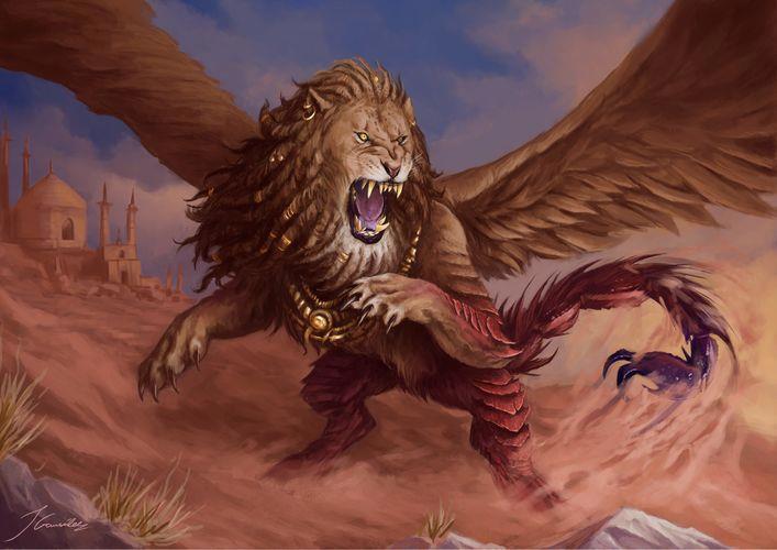 А спустя некоторое время послышались восклицания работающих рядом с ним мужчин, они прекращали работу и оборачивались назад. Северянин тоже посмотрел в ту сторону и едва не ахнул при виде донельзя странных фигур чудовищ, которых раньше он видел только на рисунках в старинной книге про страну чудес – Хиндию. В тамошних местах обитал грозный зверь мартихора. Он телом походит на крылатого льва, но очень волосатого и с чудовищной величины лапами. Его морда имеет некоторое сходство с человеческим лицом, только за исключением нижней части, она больше львиной и в его пасти имеется тройной ряд зубов, похожих на кинжалы. Сзади у него находится такой же как у скорпиона хвост, но со стрелами дикобраза, которые он способен метать во врага.