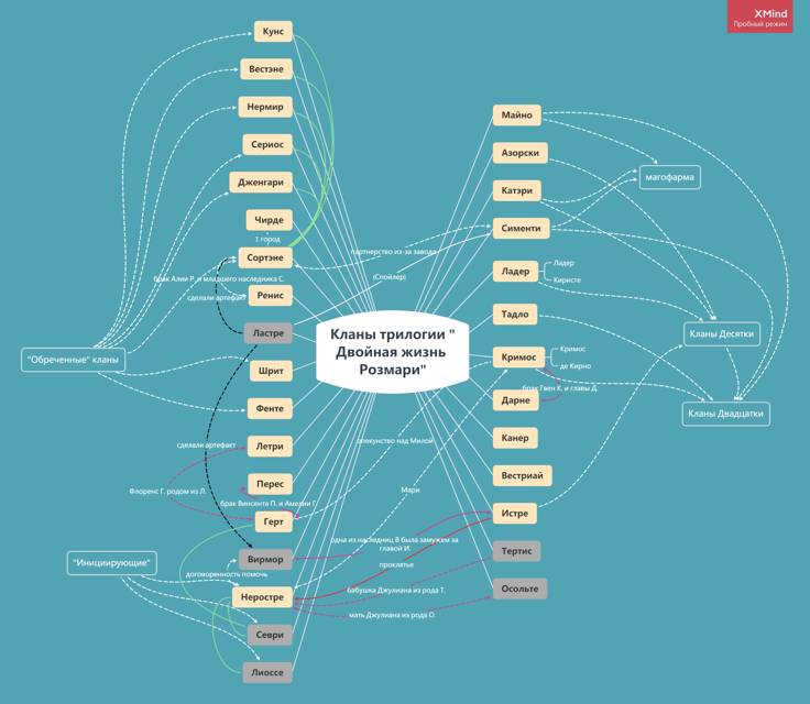 По просьбам читателей сделала примерную (!) схему сюжетно важных взаимосвязей кланов. На ней не все кланы и не все их связи, большинство кланов на самом деле так или иначе в родстве, но если сюжетно это роли не играет или играет мало, я эту связь не показывала.