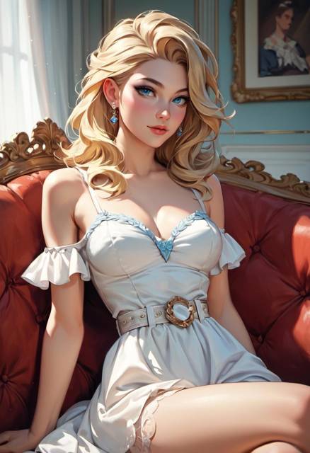 На одном из диванов сидит невысокого роста девушка с длинными светлыми волосами. Белоснежное короткое платье с пояском отлично подчеркивает образ.
