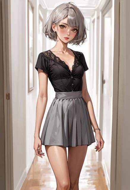 Люси стоит посреди комнаты, так же, как и Алисия, собираясь к скорой поездке. Но здесь вид куда заманчивей. Тело стройной зверолюдки с пышным хвостиком прикрывает лишь короткая красная юбка.