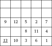Правила игры: на листке в клеточку чертится квадрат со сторонами 5 на 5 клеток (в дальнейшем можно чертить квадрат 6 на 6, 7 на 7 и т. д.). Начинающий игру ставит в любой клеточке цифру 1. Соперник должен поставить цифру 2, «сходив конем» от клеточки с единицей. (Если ребенок не знает, как ходит шахматный конь, перед началом игры надо нарисовать и объяснить ему все возможные варианты ходов.) Далее начинавший игру делает ход уже от цифры 2. Игра продолжается до тех пор, пока кто-то не окажется без возможности хода. выигрывает тот, кто поставил последнюю цифру. вариант заполненного поля на рисунке 1 (выиграл игрок, поставивший цифру 13).