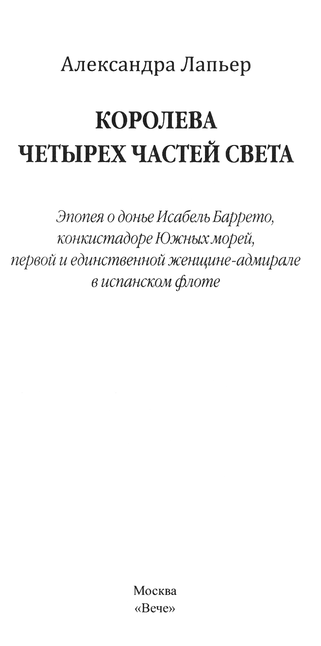 Теперь с творчеством Александры Лапьер получит возможность ознакомиться и российский читатель. Опубликованный в 2013 году роман «Королева четырёх частей света» переносит нас в далёкий 1595 год, в эпоху Великих географических открытий и завоеваний. Посвящён он Исабель Баррето – уникальной женщине, ставшей волей судьбы руководителем экспедиции испанского флота, вышедшей из Перу на поиск загадочного южного материка – «Неведомой Австралии». Как всегда, эта книга стала плодом тщательных архивных и библиотечных разысканий, а также удивительного таланта автора, сумевшего непредвзято и увлекательно рассказать о легендарной личности и её непростом времени. Вскоре после выхода книга получила несколько литературных премий, среди них две премии за лучший морской роман (Prix de la Мег 2013, Prix Marine et Oceans 2013) и премия за лучший исторический роман года во Франции (Prix Historia 2013).