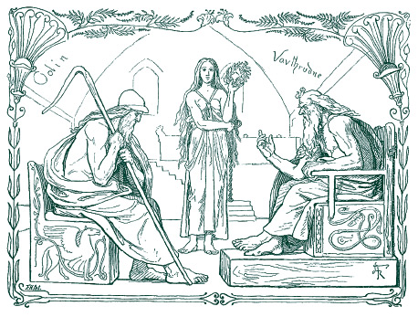 Один загадывает загадки Вафтрудниру. Гравюра Лоренца Фрёлиха.