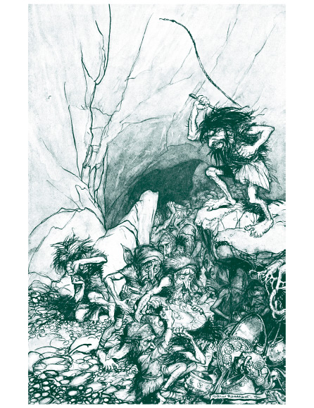 Драупнир, в отличие от Единого, не несет в себе никакого отрицательного начала, причем ни как образ, ни как элемент сюжета. Некоторые исследователи44, ища скандинавские корни в идее Кольца Всевластья, обращаются к сказанию из «Старшей Эдды» – «Речи Регина», – где излагается история проклятого золота, причем акцентное место в сюжете занимает золотое колечко. Карлик Андвари, проклиная похитителей его золота, предрекает гибель грядущим его владельцам. Но, не говоря уж о том, что проклятое золото и Единое Кольцо несут в себе зло совершенно разного свойства, подчеркнем, что кольцо Андвари далее в эддическом сюжете или вовсе не задействовано, или, по другой трактовке, действует безуспешно (Гудрун посылает кольцо своим братьям, предупреждая о грозящей гибели, но братья все равно приезжают). Даже если мы будем отождествлять кольцо Гудрун и кольцо Андвари, перед нами просто вещь, не обладающая ни магией, ни тем более собственной волей; этим оно отличается от золота Андвари, которое проклято и неизбежно несет гибель.