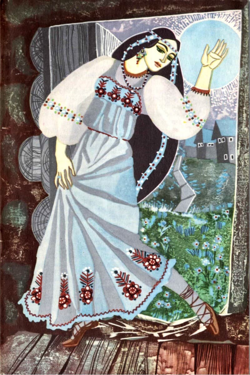 Сестра заплакала, но ослушаться не посмела, плюнула в воду, выпрыгнула из лодки, обернулась чёрной уточкой и поплыла. А Сюоятар рада, надела её подвенечный наряд.
