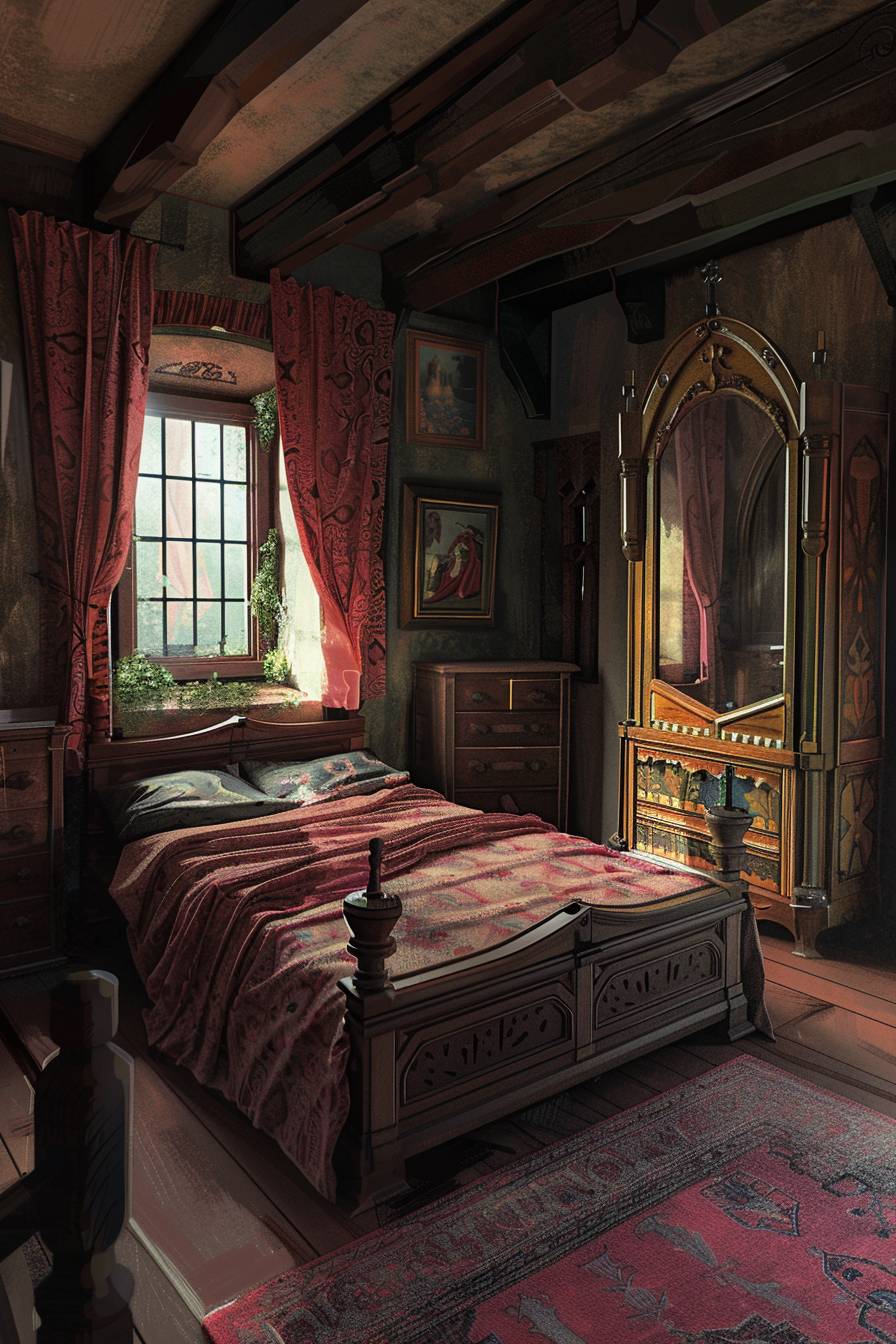 Комната, которую им отдали, располагалась на втором этаже и была небольшой. Кровать одна, но достаточно широкая, вдвоем на ней точно можно поместиться. Напротив неё стоял шкаф, украшенный дорогостоящей резьбой и зеркальными дверьми. Тяжелые портьеры были в тон ковру и покрывалу – красными. Такими же тонами обладали и картины на стене. В общем, комната была уютной и обставленной по вкусу. Всё говорило о том, что монеты у владельца дома имелись.
