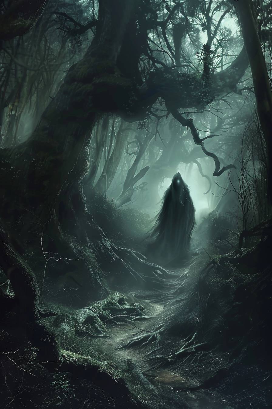Бесплотное существо, отдаленно напоминающее человека в черном плаще с капюшоном, скользило между деревьев, едва касаясь земли.