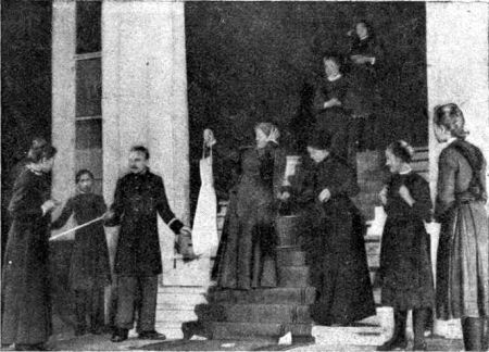 Священник проходит в церковь. Девочки здороваются с ним не реверансом, как с другими преподавателями, а низким наклонением головы.