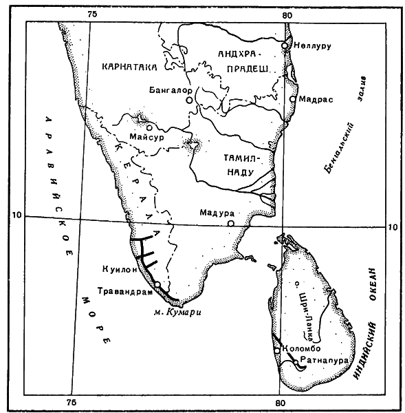 Мыс Кумари принадлежит жаркому штату Тамилнад, занимающему большую часть южной оконечности Индии. Раскинувшиеся на сотни километров под палящим тропическим солнцем равнины и каменистые холмы штата на западе упираются в горную цепь западных Гат, которая протягивается параллельно берегу Аравийского моря почти точно с севера на юг, снижаясь и превращаясь в ряд высоких холмов как раз при подходе к мысу Кумари. От него прямо на север между горным хребтом и морем тянется довольно узкая, порядка 50 километров, полоса земли, на которой расположен самый влажный тропический штат Индии – Керала, занимающий территорию древних индийских княжеств Траванкур и Кочин. Потоки влажного и горячего воздуха с Аравийского моря по пути на континент наталкиваются на каменную стену Гат, поднимаются в верхние охлажденные участки атмосферы, где и изливаются дождями на западные склоны крутого хребта, покрытые густым покровом влажных джунглей.