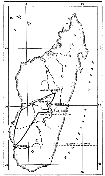 Мы еще более недели провели в Антананариву. Обсуждали с официальными лицами план наших поездок по острову, знакомились с геологическими отчетами и картами, вели подробные беседы с малагасийскими геологами. За это время мы успели детально ознакомиться с коллекциями наиболее известных в столице торговцев минералами, а также посетить салон тропических бабочек и познакомиться с его хозяйкой, миловидной француженкой средних лет.