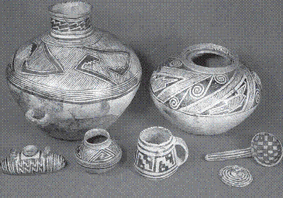 Утварь из индейского поселения Месса Верде (Колорадо) (XI–XIII66.) несет на себе спиралевидные и геометрические узоры, подобные древнекитайским