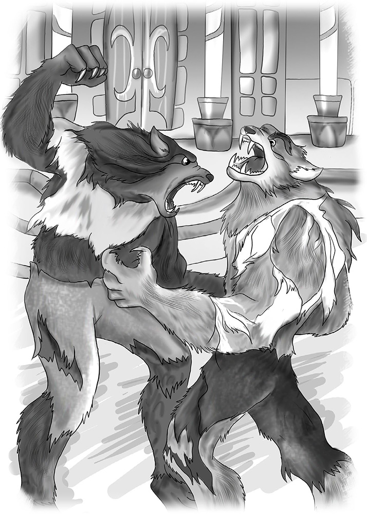 С бешеным боевым кличем, переходящим в волчий вой, лидер заговорщиков против эльфийской короны бросился вперед. Меняя обличие, Рэджис в мгновение ока оброс густой пепельно-серой шерстью, лицо превратилось в большую клыкастую волчью морду, одежда разошлась по швам и висела клочьями. Когда до края крыльца оставалось совсем немного, тварь размером с медведя, обладающая мускулистым телом человека и волчьей головой, прыгнула в умопомрачительном прыжке – от противника должно было остаться мокрое место, не более. Но Ивис принял точно такой же вид, только, в отличие от уже бывшего друга, цвет его шерсти была черной. Отбив сокрушительный удар меча сверху, правитель города Амизи сплюнул под ноги опонента, воткнул меч в землю, выпустил устрашающие когти и пошел в контратаку. Стремительные удары лап не достигали цели, хотя скорость движений Ивиса поражала воображение. Рэджис ничем не уступал врагу, они были равны в искусстве боя. Проиграет тот, кто допустит роковую ошибку.
