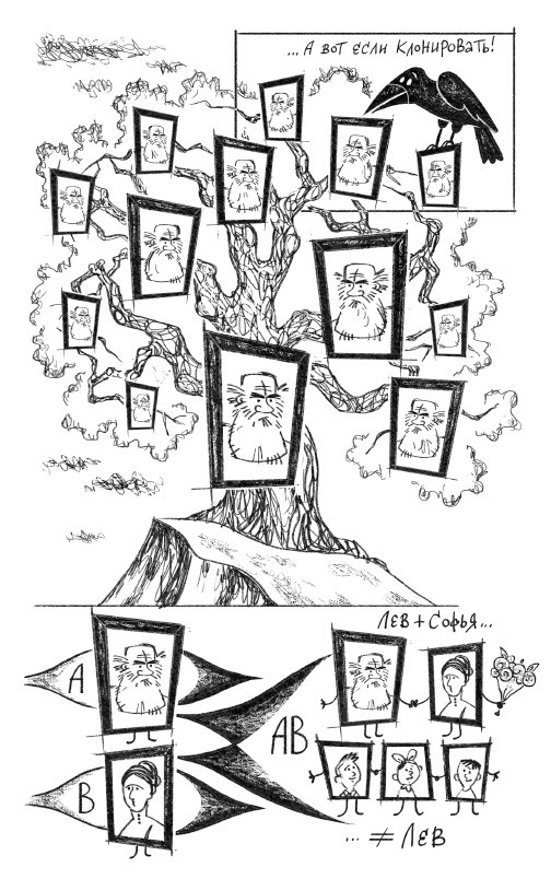 Итак, половое размножение, которому классик отдал дань в своей жизни и творчестве, приводит к тому, что комбинации его генов в потомстве не сохраняются. С одной стороны, это обидно, так как разрушаются удачные комбинации. С другой, видимо, полезно: еще не факт, что Лев Николаевич был бы приспособлен к преподаванию итальянского языка, разведению оленей в Швеции или ведению бизнеса в Калифорнии, а в его потомках такие качества присутствуют. Таким образом, половое размножение создает новые комбинации генов, готовые к завоеванию новых экологических ниш. Среди потомков писателя есть даже господин Петр Толстой, депутат и публицист. Кто мог предсказать, что гены не кого-нибудь, а Льва Толстого можно перетасовать со столь ошеломляющим результатом.