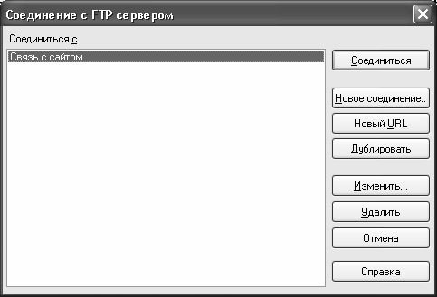При необходимости вы всегда можете изменить настройки FTP-соединения. Для перехода в режим редактирования нужно в окне списка соединений (см. рис. 1.5) выделить соответствующую позицию щелчком мыши и нажать в правой части окна кнопку Изменить. В результате на экране откроется окно настройки FTP-соединения (см. рис. 1.4), с которым мы уже познакомились.