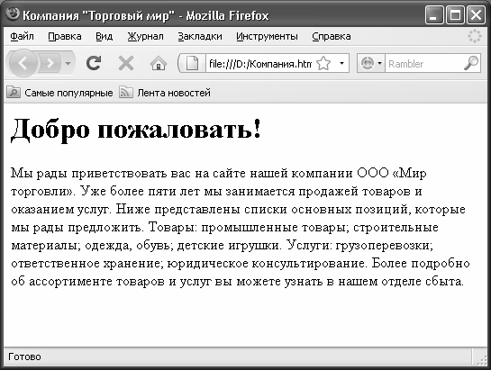 Предположим, что наша веб-страница, которую мы назовем Компания «Торговый мир», должна содержать следующий текст.